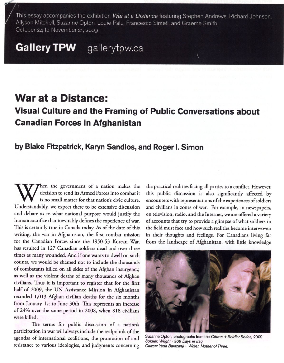 Curatorial Essay (co-authored with Karyn Sandlos and Roger I. Simon): War at a Distance: Visual Culture and the Framing of Public Conversations about Canadian Forces in Afghanistan